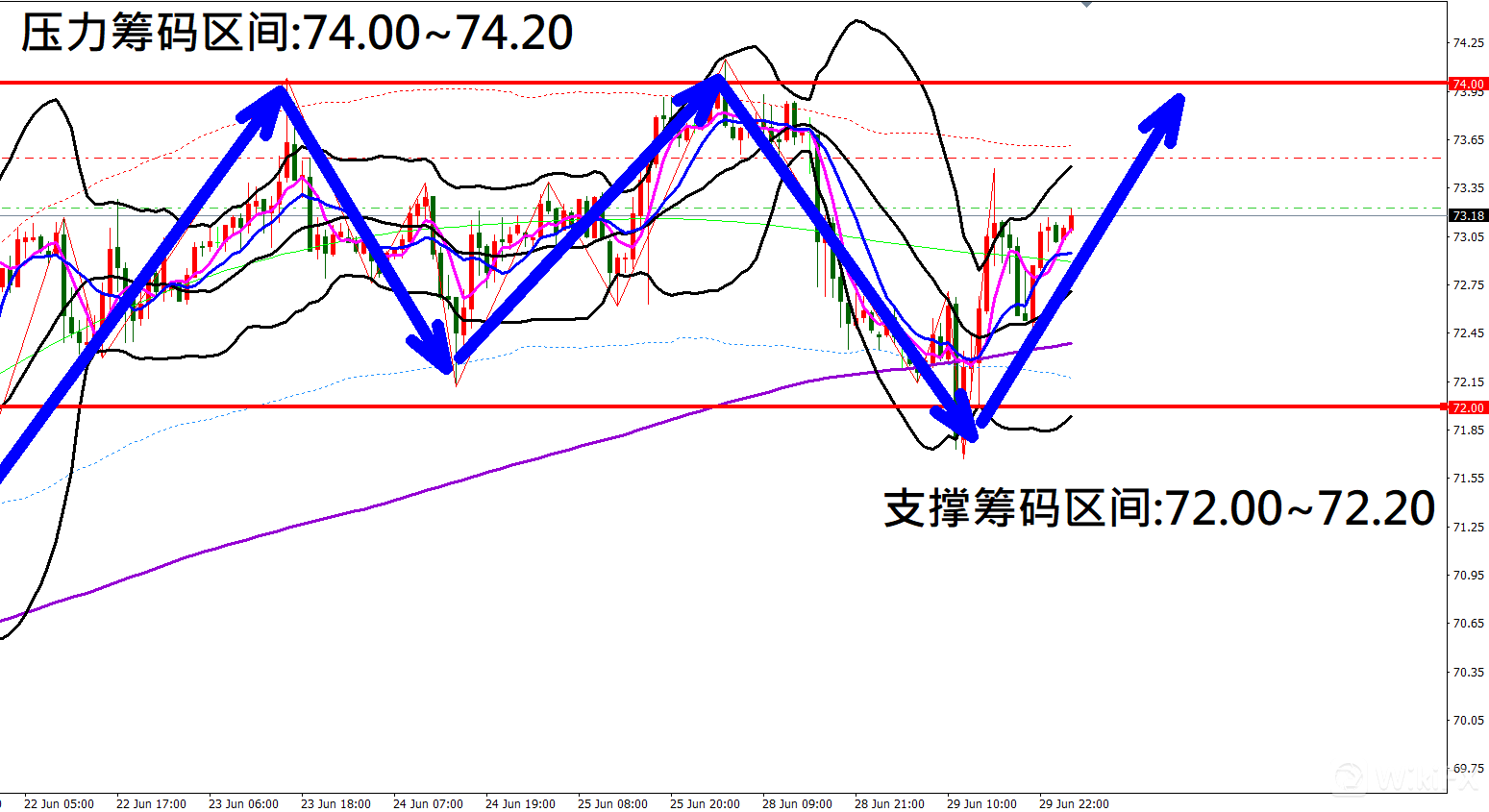 今日美国原油(6月30日)早盘在73.12附近,从技术分析面切入,1小时线级别观察走势架构昨日(29日)K棒盘中小幅拉回修正后出现反弹上涨行情,目前K棒落在布林通道中轨与上轨之间,同时开口转折朝上,因此有机会持续反弹上涨。