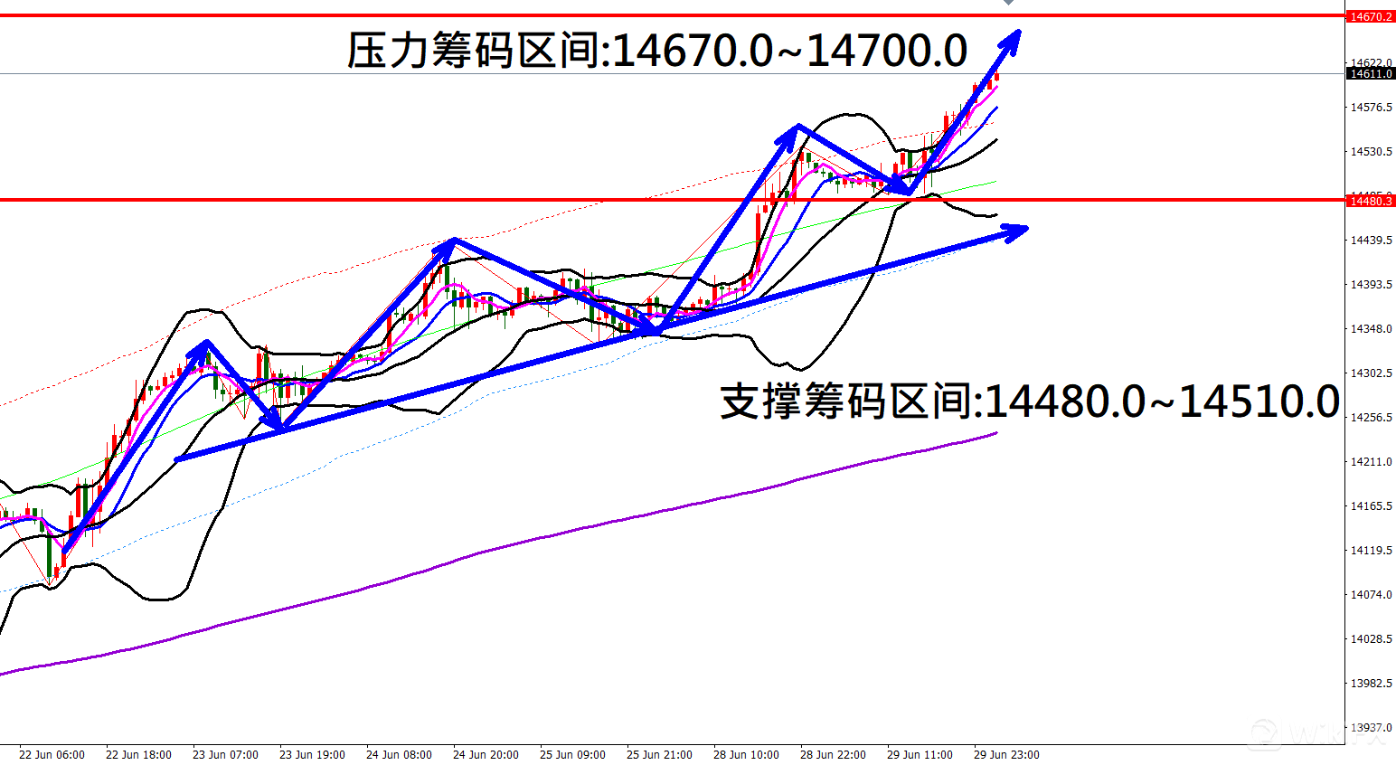 今日纳指(6月30日)早盘在14602.8附近,从技术分析面切入,1小时线级别观察走势架构昨日(29日)K棒盘中再度反弹上涨,目前K棒落在布林通道中轨与上轨之间,同时开口持续朝上,因此有机会持续反弹上涨行情。