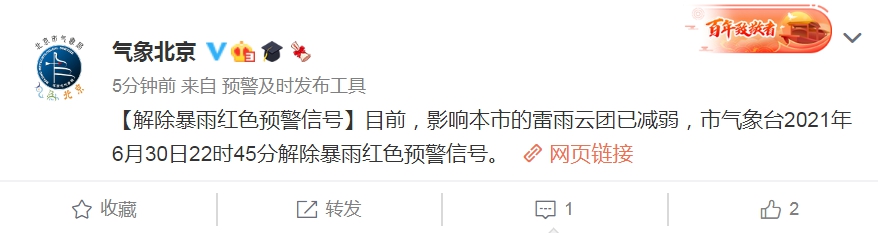 30日晚22时45分,北京市气象台微博发布消息称,目前,影响本市的雷雨云团已减弱,市气象台解除暴雨红色预警信号。