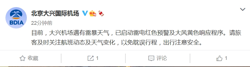 北京大兴国际机场官方微博30日晚22时发布提醒,目前,大兴机场遇有雷暴天气,已启动雷电红色预警及大风黄色响应程序。请旅客及时关注航班动态及天气变化,以免耽误行程,出行注意安全。