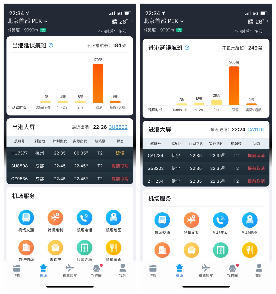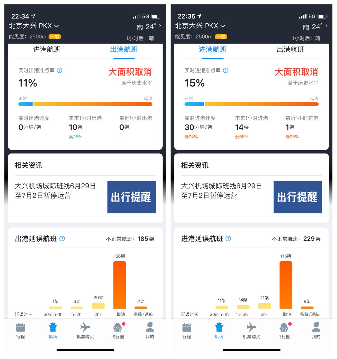 此外,飞常准APP显示,截至22时34分,北京首都国际机场进出港航班也出现航班大面积取消情况,取消航班370架次。