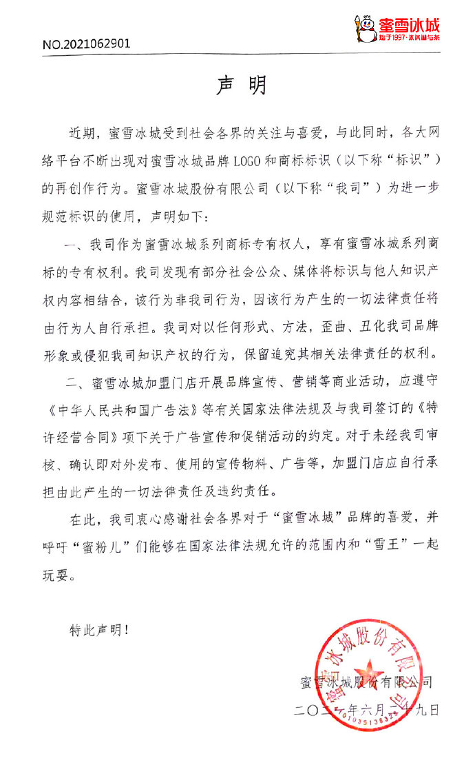 声明称,近期,各大网络平台不断出现对蜜雪冰城品牌LOGO和商标标识(以下称“标识”)的再创作行为。蜜雪冰城作为蜜雪冰城系列商标专有权人,享有蜜雪冰城系列商标的专有权利。有部分社会公众、媒体将标识与他人知识产权内容相结合,该行为非蜜雪冰城行为,因该行为产生的一切法律责任将由行为人自行承担。