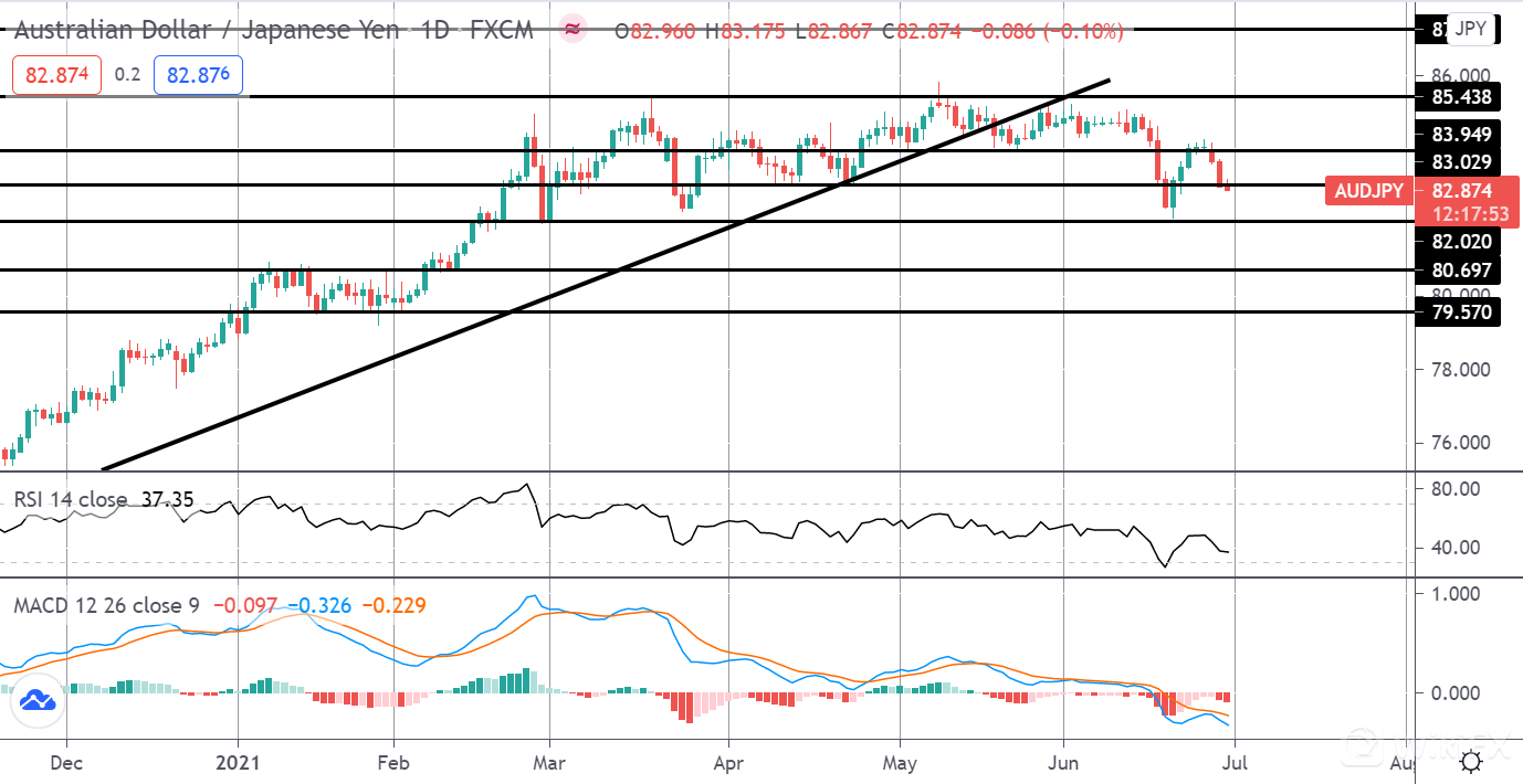 由于新的封锁公告,本周澳元的大量抛售导致澳元兑一揽子货币走弱。鉴于澳元的高贝塔系数,其兑美元和日元等避险货币的走势更为明显。随着对 delta 变体的担忧加剧,日元进一步避险走强的风险为澳元兑日元提供了下行机会。