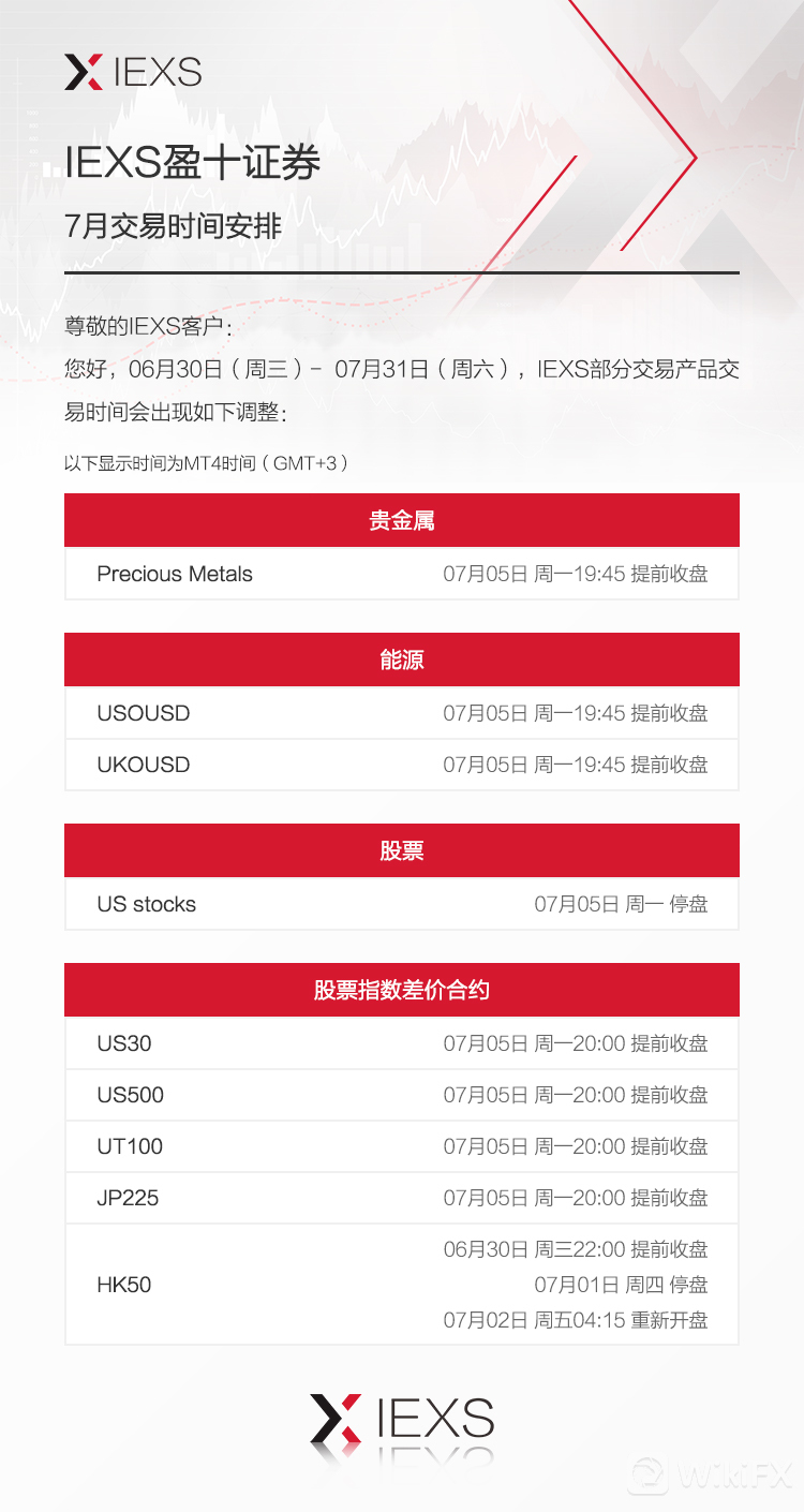 尊敬的IEXS客户: 您好,2021年6月30日(周三)-2021年7月31日(周六),IEXS部分交易产品交易时间将出现相应调整如下: 【影响范围】全体交易帐户 在此期间,IEXS证券客户服务正常进行。 祝您交易愉快 文章导航 石头证券:黄金突遭大单砸盘!行情考验平台流动性 石头证券Trading Central每日策略午报-20210630