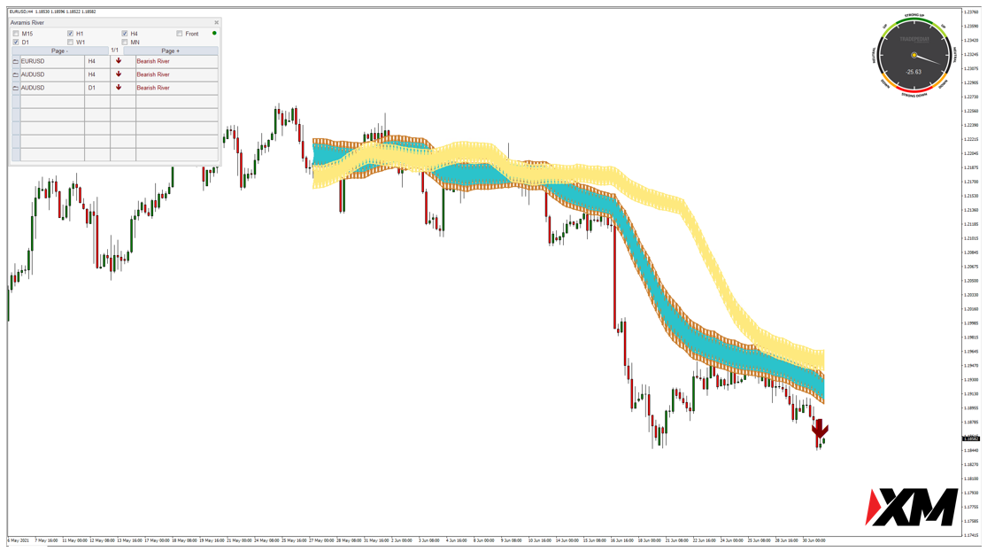 系统显示欧元兑美元 EURUSD H4级别出现了看跌河流的信号。