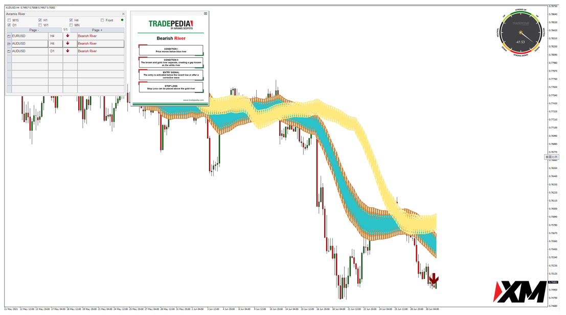 系统显示澳元兑美元 AUDUSD H4级别出现了看跌河流的信号。