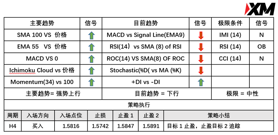 入场价位:1.5816,止损价位:1.5742,止盈目标一:1.5847,止盈目标二: 1.5891。