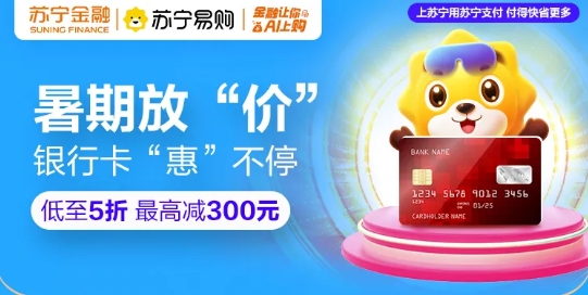 即日起至7月31日,苏宁支付联合建行、交行、光大、农行、广发、平安、浦发、兴业、华夏、江苏苏宁银行、邮储江苏分行等国内多家银行,共同开展分期支付满减优惠,上苏宁易购买买,使用上述指定银行卡,至高可减300元。登陆“苏宁金融APP-更多-银行卡优惠”,可以了解更多详情,具体规则以活动页为准。