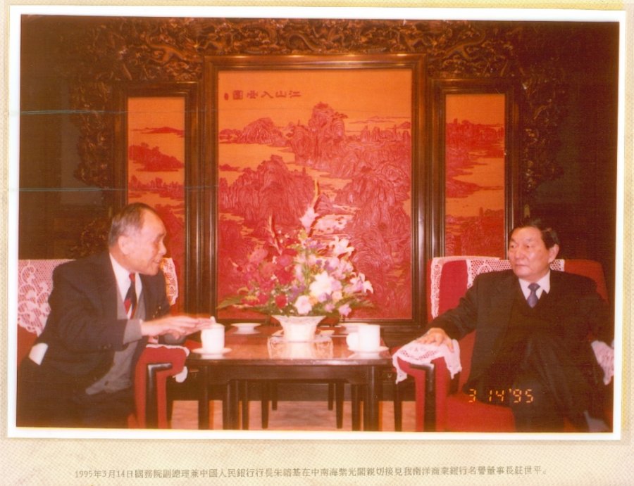 图:1995年朱镕基副总理在中南海紫光阁会见庄世平,回应南商在京设立分行事宜。