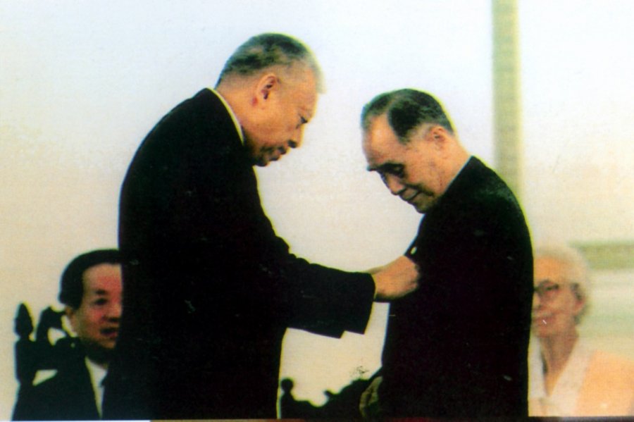图:1997年时任香港特首董建华为庄世平颁授紫荆勋章。