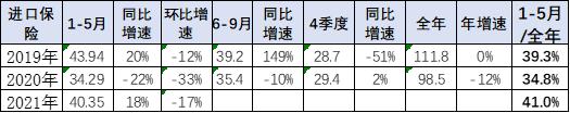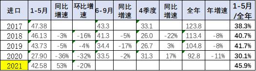 从月度走势看,近几年的整车进口呈现季节性特征,夏季增速走高后见顶回落特征明显。2021年1-5月进口较2019年同期稍低,形成与2020年同期较大反差。