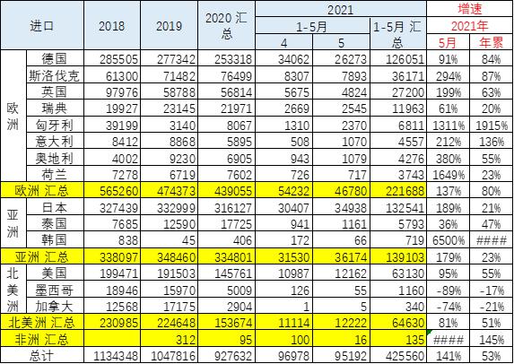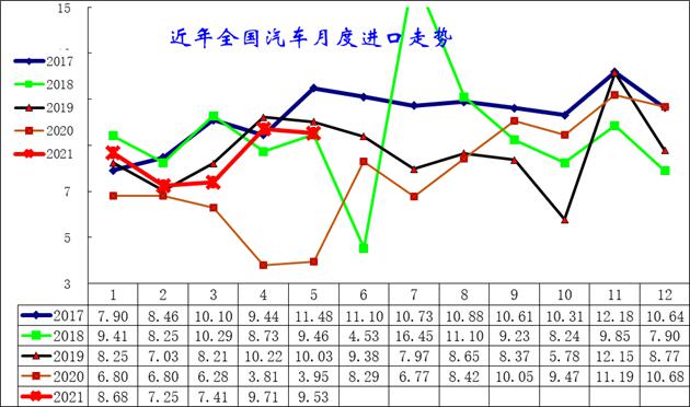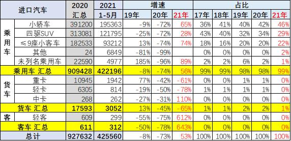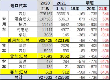 2017-2019年的进口车市场是相对稳定的。2021年1-5月整车进口43万台,相对2020年增加15万台。