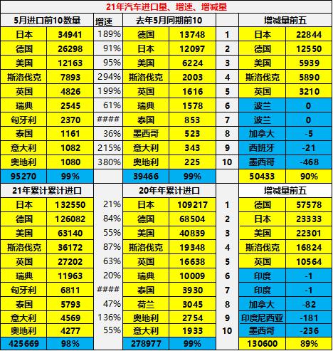 2021年1-5月进口车数据表现相对优秀的是德国进口车,匈牙利和意大利的进口车数量同比增长惊人。日本等亚洲国家进口车数据表现波动。