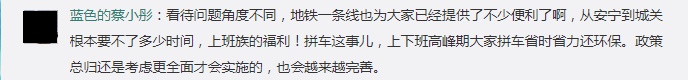 也有网友表示支持,认为:“看待问题角度不同,地铁为大家已提供了不少便利,从安宁到城关根本要不了多少时间,上下班高峰期大家拼车省时省力还环保。政策总归还是考虑更全面才会实施的,也会越来越完善。”
