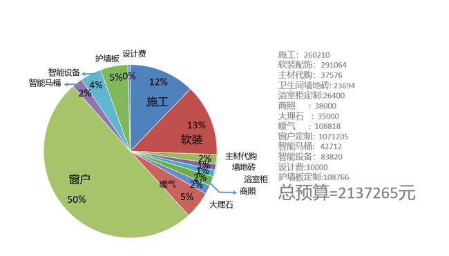 根据他在三翼鸟海尔智家望京店的消费明细,我们看到:总消费2137265元,其中门窗占比50%,施工和软装分别占比12%、13%。墙板、大理石、墙地砖等硬装合计消费占比为8%,暖气占5%,主材代购占2%,设计费占比0.46%。而以智能设备、商照、智能马桶为主的智能家电消费合计占比仅为8%,算一下才不到17.1万。