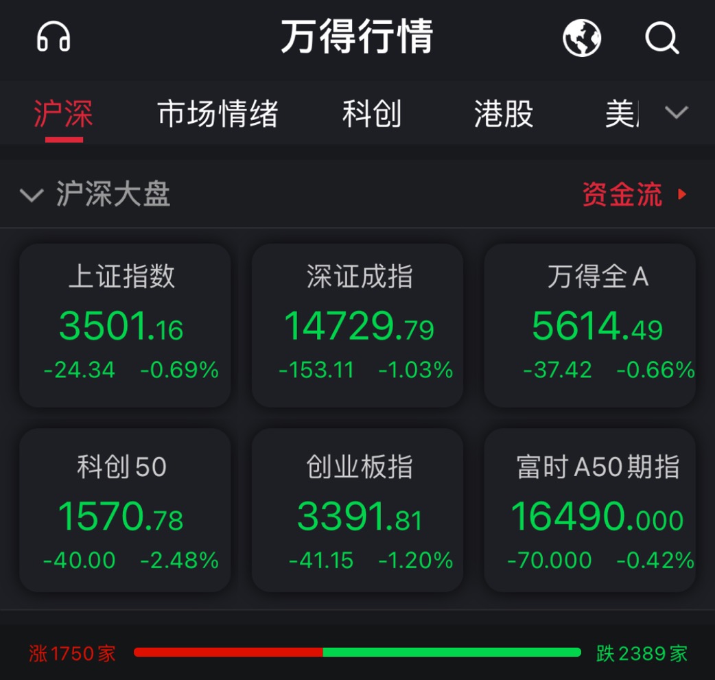 截至午间收盘,沪指报3501.16点,跌幅0.69%,成交额3091.45亿元;深成指报14729.79点,跌幅1.03%,成交额3942.85亿元;创业板指报3391.81点,跌幅1.2%;上证50指数报3338.47点,跌幅1.03%。