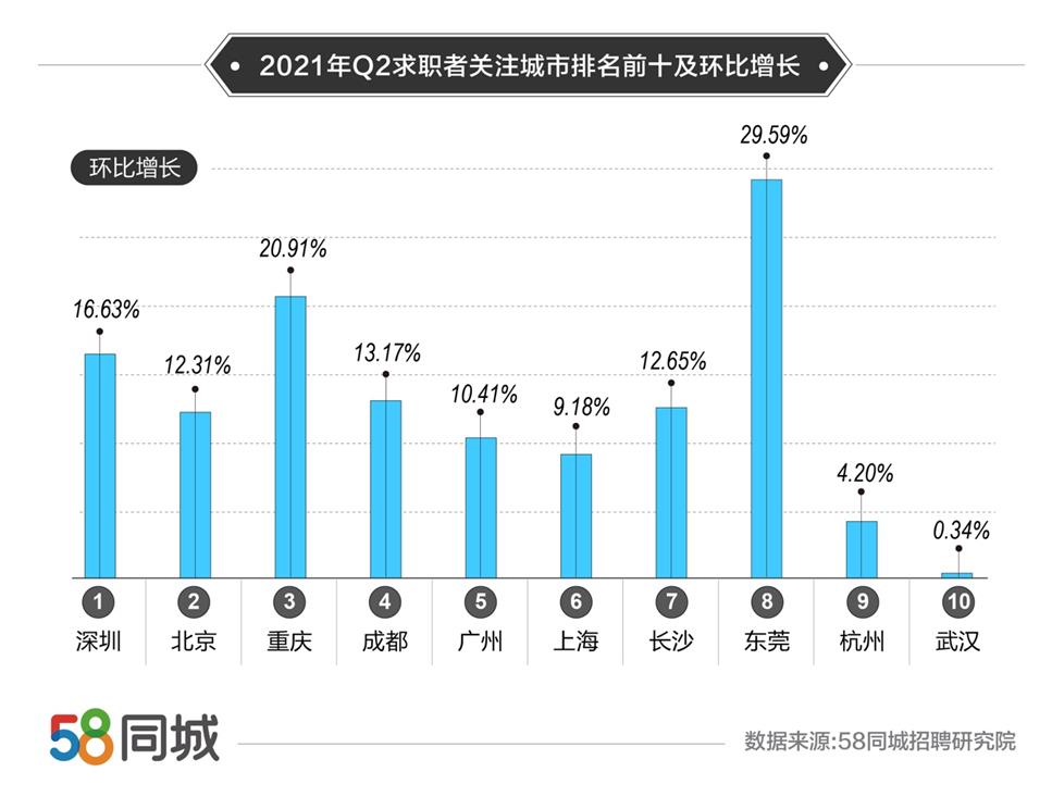 一线城市中,深圳和北京仍然是劳动者应聘时的优先选择。两大城市不仅提供了丰富的就业机会,也拥有更高的收入水平和更好的职业发展路径。此外,重庆、成都这类人文氛围浓厚的城市也深受求职者欢迎,因此这两地在2021年二季度超越广州和上海,成为求职者的就业新去处。