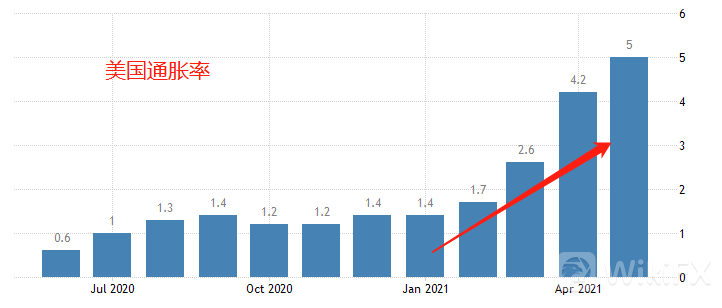 最新的美国CPI为5%,如此高的通胀,很难发现有通货紧缩的迹象。可美债收益率的大跌,确实只有在经济衰退和通货紧缩的时候出现。合理的解释,可能是因为美联储主席鲍威尔过度强调暂时性通胀,导致市场对远期的美国CPI数据保持悲观。美联储依旧维持800亿每月的国债购买,这或许构成了债券价格上涨、收益率下跌的核心力量。