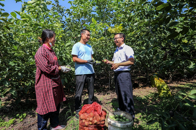农行河北省分行依托国家级农业产业化龙头企业——河北绿岭果业,围绕企业“公司+合作社+基地+农户”的经营模式,进一步延伸金融服务触角,为优选与企业形成利益联结的种植农户提供批量金融支持,带动农户增收致富,助力乡村振兴。图为该行客户经理在河北省邢台市临城县了解绿岭果业签约种植户核桃收成情况。