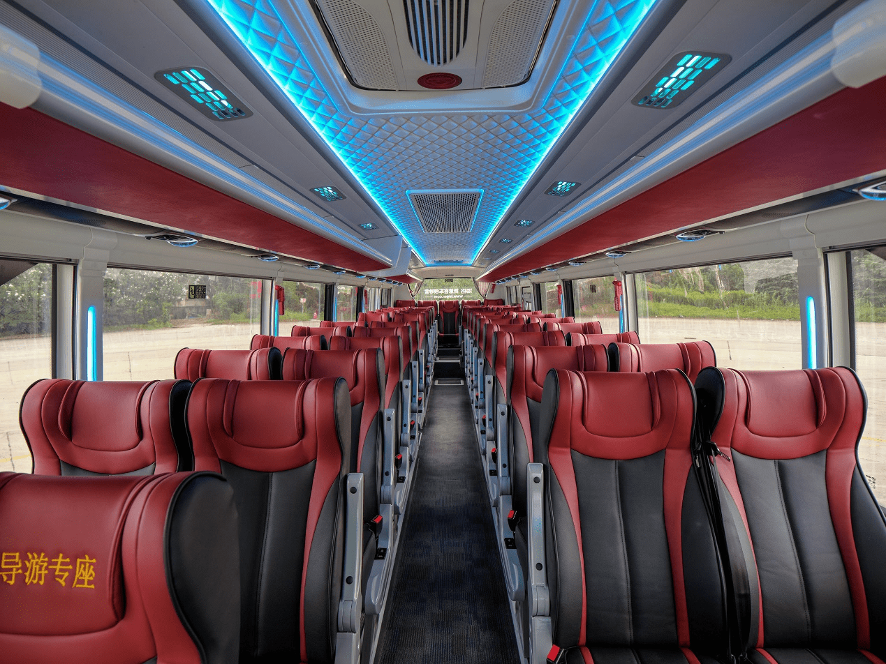 乘客区全新升级的海格商务内饰,酒红与雅黑拼色的2+1商务座椅,高铁下拉式窗帘、水杯座、USB接口、手机槽等,每一个细节都符合“高端商旅”这一设定。