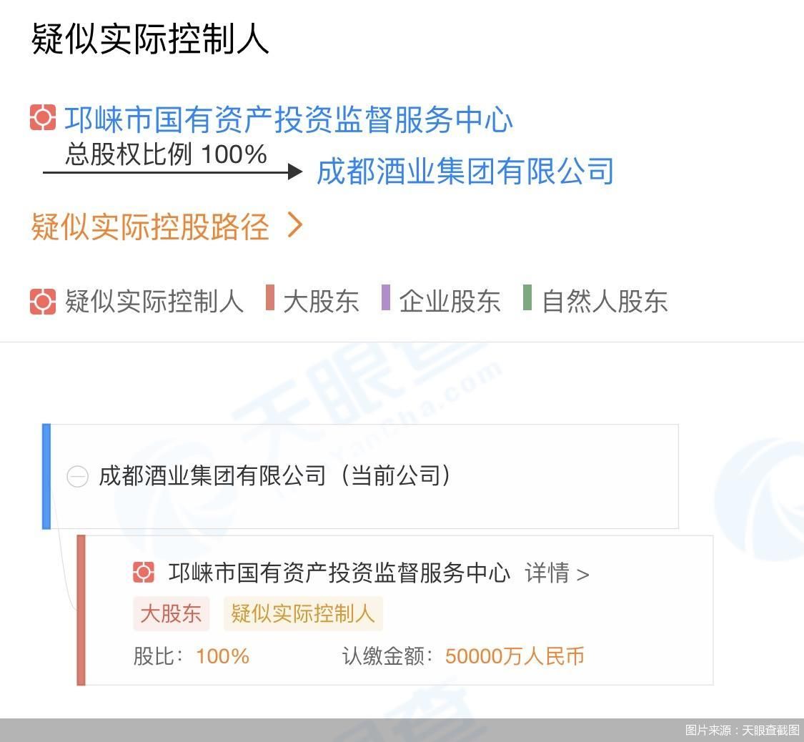 成都酒业集团的成立,是由邛崃市人民政府牵头,邛崃市国有资产投资监督服务中心参与组建。据了解,成都酒业集团实际控制人为邛崃市国有资产投资监督服务中心,持有成都酒业集团100%股权,注册资本为5亿元。