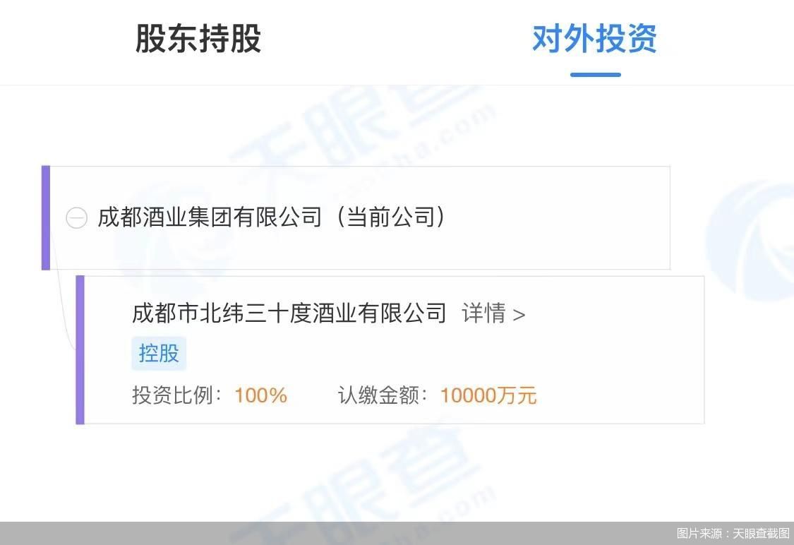 北京商报记者通过天眼查了解到,成都酒业集团在成立后5天就成立了100%控股子公司成都北纬三十度酒业有限公司。据了解,成都北纬三十度酒业有限公司的经营范围是酒类经营、旅游业务和食品经营等,注册资本为1亿元。业内人士分析认为,成都北纬三十度酒业有限公司的成立,是为成都酒业集团未来在酒类的销售业务做铺垫。