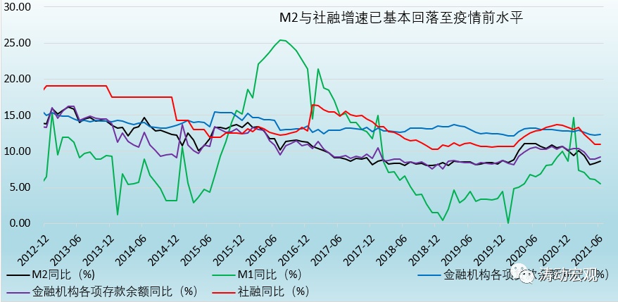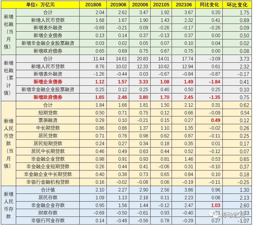 近年来的政策均明确“保持M2、社融增速与名义经济增速基本一致”,并以此为基础保持宏观杠杆率水平基本稳定。虽然今年6月的M2与社融大超预期(票据融资和企业中长期贷款同比明显多增、房贷少增、企业存款同比亦大幅多增),但增速基本上已回归到疫情前的水平,较疫情期间下降明显(今年前6个月企业债券和政府债券同比分别少增1.84万亿和1.35万亿、合计少增3.19万亿)。例如,2021年6月,M2、社融存量、贷款余额与存款余额同比增速分别降至8.60%、11%、12.30%和9.20%,已经和疫情前的平均水平相当。