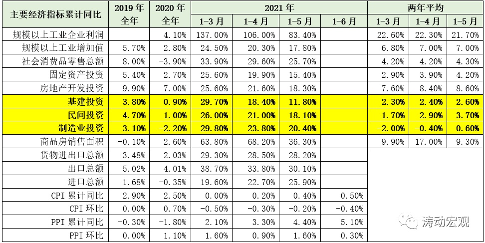 (二)从三驾马车的表现来看,消费与投资等内需整体上仍处于低位缓慢修复态势,房地产投资与贸易端延续了2020年的表现,对上半年的经济修复贡献力度较大,如1-5月的房地产投资累计同比、货物进出口总额累计同比分别达到8.60%和28.20%。其中,房地产投资累计同比的两年平均值高达8.60%,1-5月民间投资与制造业投资累计同比的两年平均值则分别为3.70%和0.60%,较2019年的水平还有不少距离。