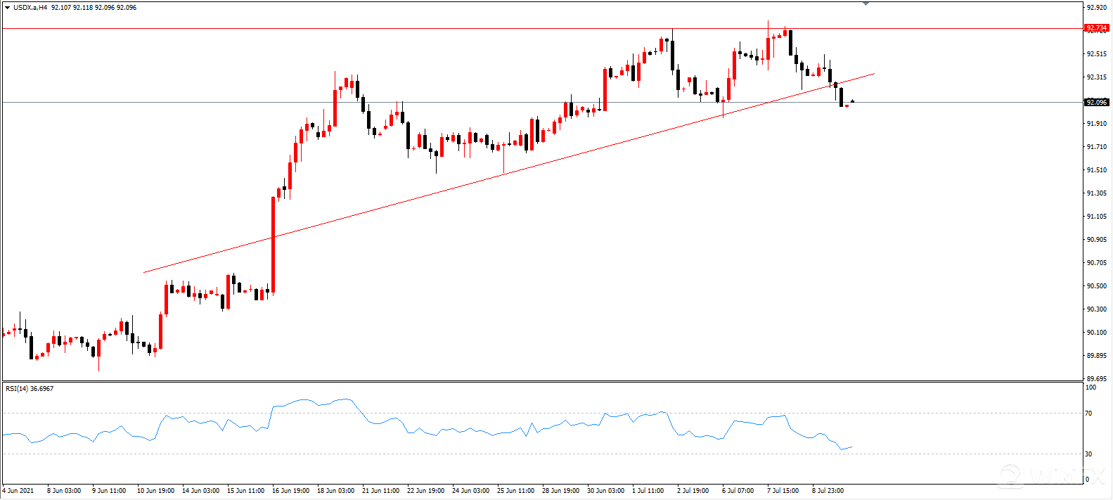 美元指数在前期日线高点受阻,价格被打压下行,突破了水平的颈线和前期低点连成的趋势线。