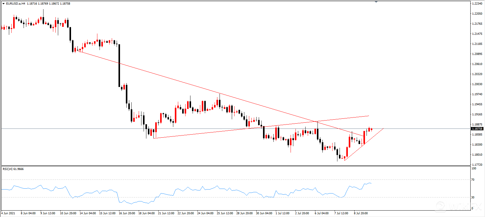 由上图H4级别中,欧美价格上传了斜向下趋势线的压制,同时,上升的低点也连成了新的短线趋势线。