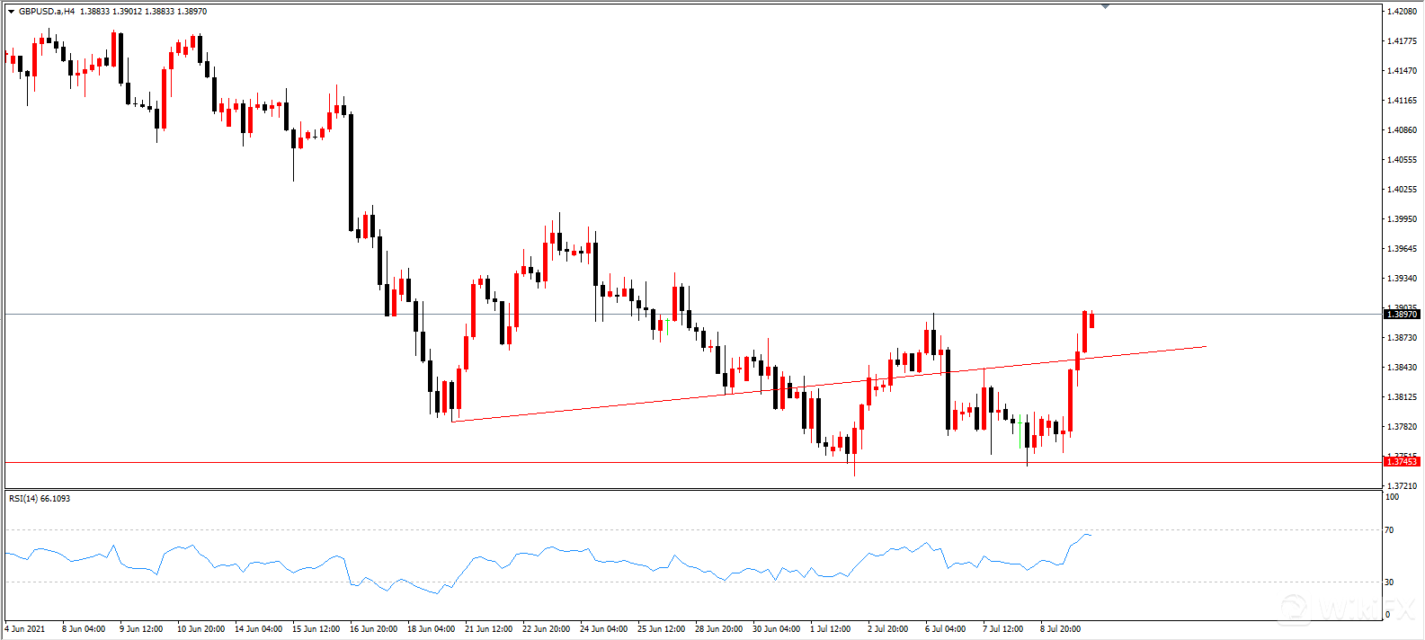 镑美RSI同样强势,来到70附近,并且涨幅很快。