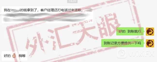 没有多久,该平台的客户经理对此延误出金表达了歉意,并立即处理了被拖延的出金。最终,交易者收到了成功到账的短信!