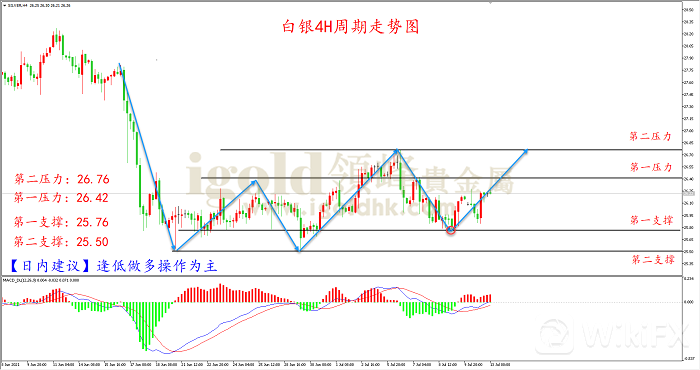 从上图白银4小时来看,白银自跌至25.50附近后,价格展开底部震荡反弹,从震荡节奏看,震荡高低点有逐步上移的现象,意味着当前白银处于震荡上行,结合MACD指标来看,DIFF线与DEA线处于零轴偏下方空头区域,双线金叉往上运行,并且红色能量柱有持续增强的迹象,表明当前行情处于弱势反弹中,日内可等待回踩25.76附近尝试多单。