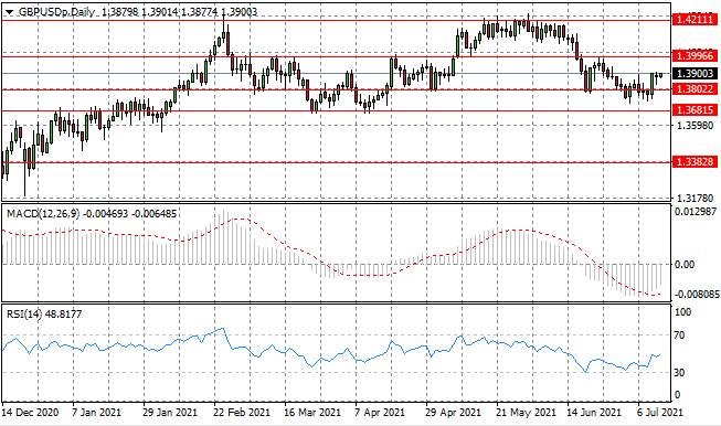 The GBPUSD pair has rebounded from the 1.380 support level, yet since the move, bullish conviction has begun to wane. Price action is now languishing mid-range between the 1.380 and 1.399 price levels. Momentum indicators have upward trajectories.