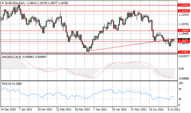The Eurodollar is being contained by the ascending trendline which has now developed as a resistance level for the pair. The pair has currently maintained the break of the 1.184 price line and may now consolidate within the current range. Momentum indicators are pulling away from oversold conditions.