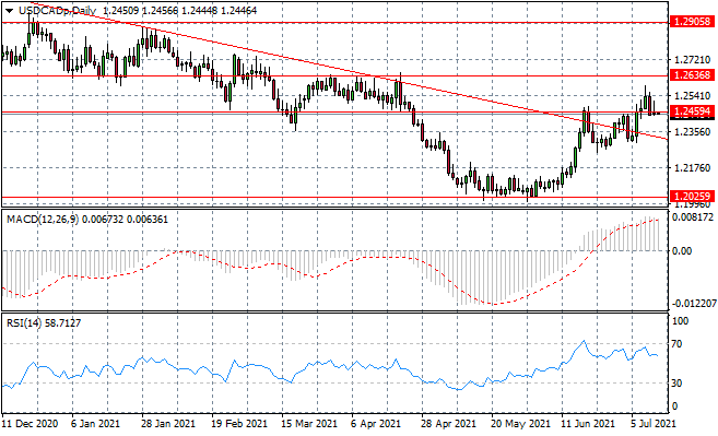 The USDCAD has pulled back to the 1.245 support level, yet a break has not materialised despite the sharp rise in bearish sentiment. Buyers will be tested in the process of establishing a trend change, as sellers remain active. Momentum indicators have flattened in bullish territory.