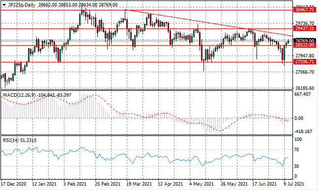 The JP225 index has broken the 28,532 resistance line and the next obstacle is the descending trendline. Typically bearish pullbacks occur at this resistance line, therefore strong bullish conviction will be required to overcome tis resistance levels. Momentum indicators are bullish.