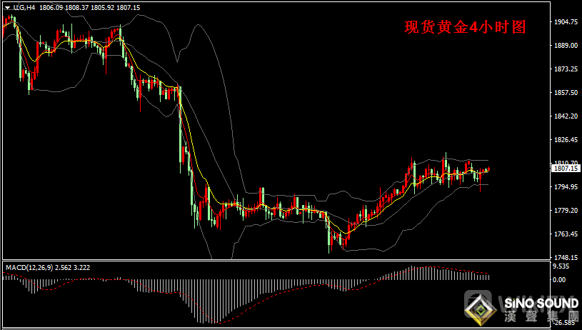 金价4小时图看,金价布林带三轨持续走平,金价持续在布林通道内振荡运行。短期均线EMA5与EMA10双线维持胶结;MACD指标正动能柱持续,RSI指标维持在中线50位置上方,目前RSI指标在56位置附近徘徊。今日短线操作建议,估计亚市金价在1805-1812区间运行,如金价突破该区间上方看1818-1820,或如金价跌破该区间下方看1800-1798。