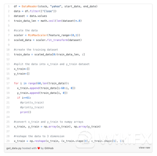 首先,我们使用 pandas_datareader 从雅虎财经读取数据。接下来,为了让 LSTM 模型正常工作,必须以正确的方式对数据进行预处理。为此,我们可以使用 Scikit-Learn 中的 MinMaxScaler 和模块 NumPy。我们还必须创建 x_train 和 y_train 数据列表发送到下一个模型中。