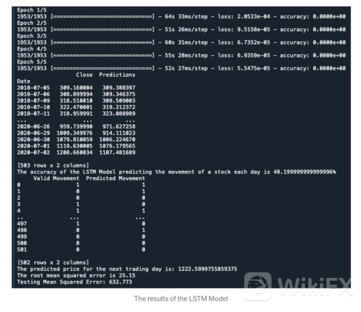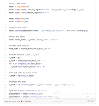 在这里,我们必须构建、编译和训练 LSTM 模型以获得最终预测。幸运的是,TensorFlow 和 Scikit-Learn 使我们能够轻松完成这项工作。模型生成后,我们可以在测试数据上对其进行测试,以接收我们的最终预测,看看它的准确度。对于这个特定模型,我们将 epochs 设置为 5,但你可以更改它来查看它如何影响模型的输出。