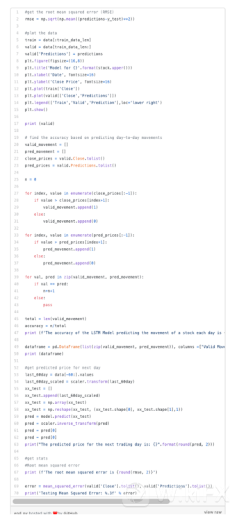 现在是有意思的部分。我们成功地使用 LSTM 模型来“预测”TSLA的股价,最终可以找到想要的答案。在代码的这一部分中,我们绘制了训练数据、测试数据和预测数据,并收到了一系列其他指标,例如预测日常运动的准确性、下一个交易日的预测价格,以及模型的均方根误差和检验均方误差。
