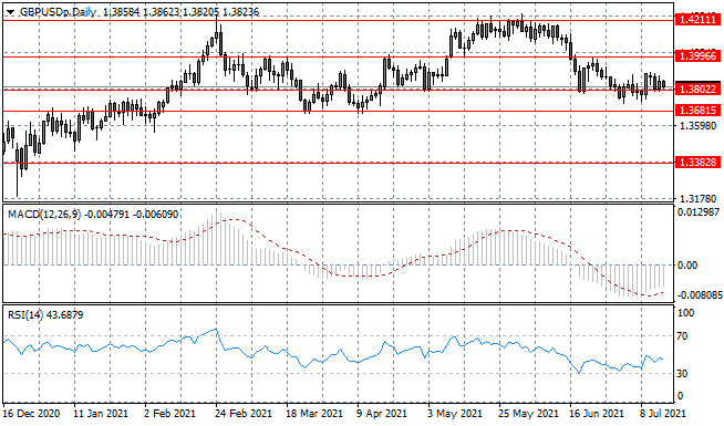 The GBPUSD pair is beginning to settle at the 1.380 support level, where oscillations are seeing price action return to this price level with consistency yet lacking conviction for the break. The pair is likely to consolidate within this range. Momentum indicators have upward trajectories.