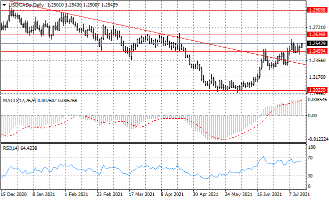 The USDCAD has begun to climb back towards the 1.263 resistance line, which has represented a hurdle for buyers on previous occasions. Bullish sentient appears strong into the move. Momentum indicators have reflect the bullish sentiment, yet are approaching overbought conditions.