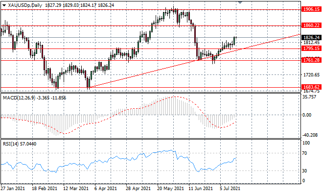 XAUUSD继续向1860阻力线攀升,看涨势头经历一段不确定性后开始攀升。趋势线仍将作为反弹的关键支撑位。动量指标有上升的轨迹,指数平滑移动平均线(MACD)测试零线。