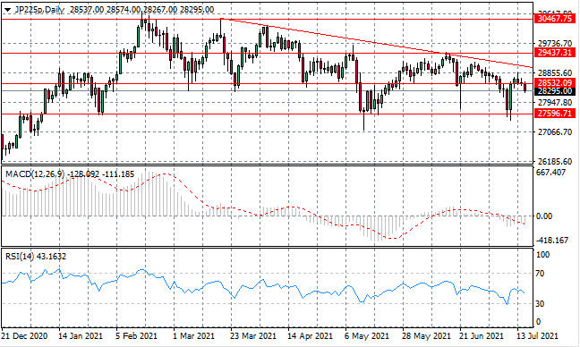 The JP225 index has broken the 28,532 support level, as further confirmation of the longer-term bearish sentiment. Oscillations have typically only gone as far as the trendline which is a strong resistance zone. Further downside may be anticipated. Momentum indicators are bearish.