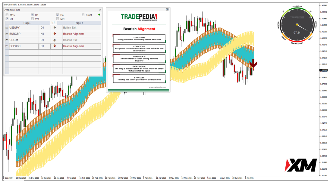 系统显示英镑兑美元 GBPUSD D1级别出现了看跌排列的信号。