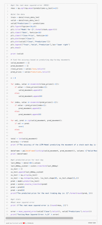 在这里,我们必须构建、编译和训练 LSTM 模型以获得最终预测。幸运的是,TensorFlow 和 Scikit-Learn 使我们能够轻松完成这项工作。模型生成后,我们可以在测试数据上对其进行测试,以接收我们的最终预测,看看它的准确度。对于这个特定模型,我们将 epochs 设置为 5,但你可以更改它来查看它如何影响模型的输出。