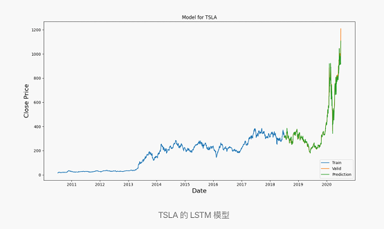 现在是有意思的部分。我们成功地使用 LSTM 模型来“预测”TSLA的股价,最终可以找到想要的答案。在代码的这一部分中,我们绘制了训练数据、测试数据和预测数据,并收到了一系列其他指标,例如预测日常运动的准确性、下一个交易日的预测价格,以及模型的均方根误差和检验均方误差。