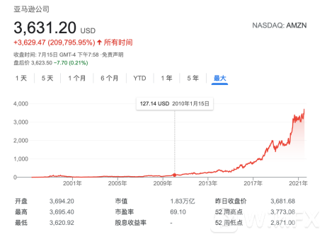 现在让我们快进到今天来看。亚马逊股票的增长是爆炸性的,但是如果您今天考虑购买该股票,这对你来说会是一个好的机会吗?我知道该股票在未来十年内可能还会继续攀升,但在市盈率100多上下。在这样的市盈率下,你为未来的增长支付了比公司实际收益高得多的溢价。