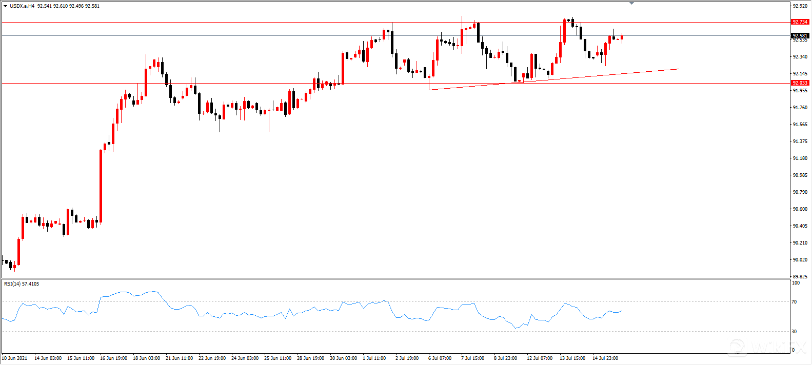 由上图4小时级别中,美元指数在昨日未能试探高点和低点,波幅收窄,但是总体来看,低点有慢慢向上抬升的趋势。